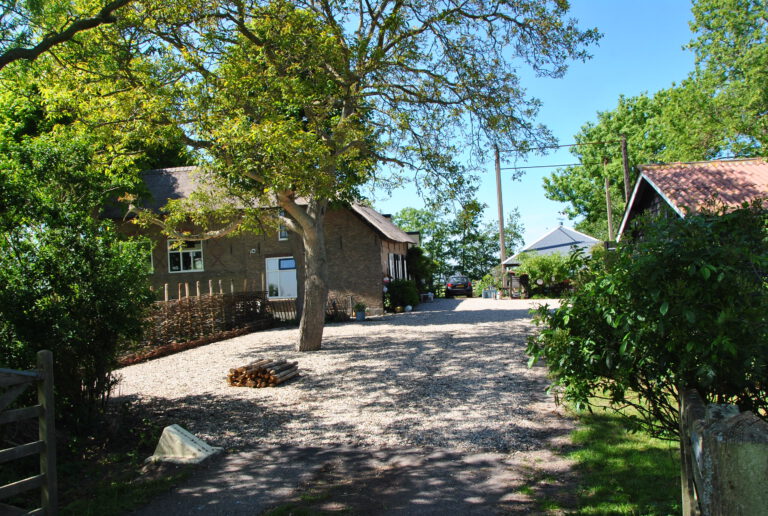 Via een oprijlaan met aan beide zijden de befaamde wilgenbomen kom je aanrijden bij onze boerderij. Die ligt in een kleine oase midden tussen de groene weilanden met aan de ene kant de koeien en aan de andere kant de paarden. Het terrein wordt begrensd door kleine slootjes waardoor het een soort eiland is met daarbinnen nog een klein schiereiland. Overal staan bomen; o.a.appel-, peren-, walnoten-, hazelnoten-, pruimenbomen, meidoorn, linden, essen en natuurlijk die hele mooie wilgenbomen. In het voorjaar genieten we van de steeds groener wordende bomen met prachtige bloesem en aan het einde van de zomer oogsten we al dat lekkere fruit. Allerlei soorten vogels (waaronder zwaluwen, een ooievaar, een valk of een velduil) fladderen om je heen en in de sloten hoor je de kikkers kwaken. En in de verte zie je de skyline van Delft, Rotterdam en Den Haag want het groene gebied van Midden Delfland ligt als een soort Central Parc tussen de steden (slechts 30 minuten per fiets). Door het weidse gezicht kun je vanuit de hangmat genieten van een schitterende zonsopkomst en -ondergang. Onze historische boerderij bestaat uit 2 delen; het voorste deel stamt nog uit ergens rond 1655 met een rieten dak, een ouderwetse melkkelder en een opkamer. Het achterste deel, de vroegere stal, is in 2000 herbouwd met gebruik van de oude balken. Naast de boerderij bevindt zich de hooiberg.